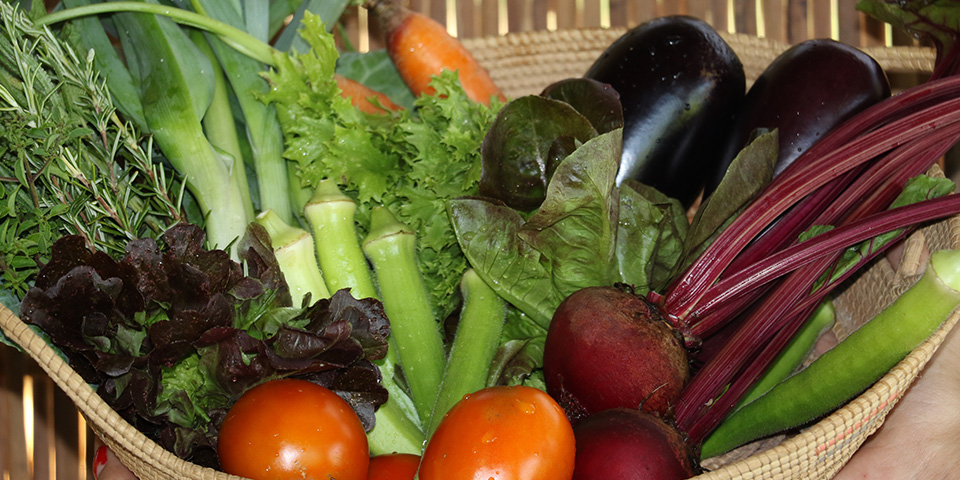 Na chegada, os hóspedes escolhem os itens de nossa horta agroecológica que desejam levar para suas casas e, no check-out, recebem uma cesta completa.