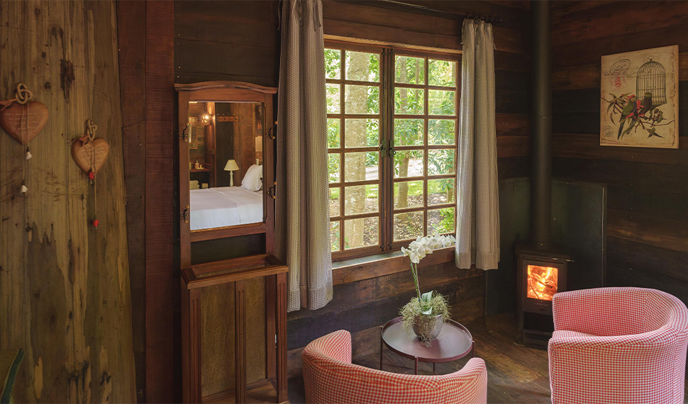Construído todo em madeira de demolição, e com o requinte e a elegância de uma decoração rústica, o chalé oferece a vista espetacular das copas das árvores, permitindo que a natureza esteja ao seu lado, em uma extensão da própria floresta.