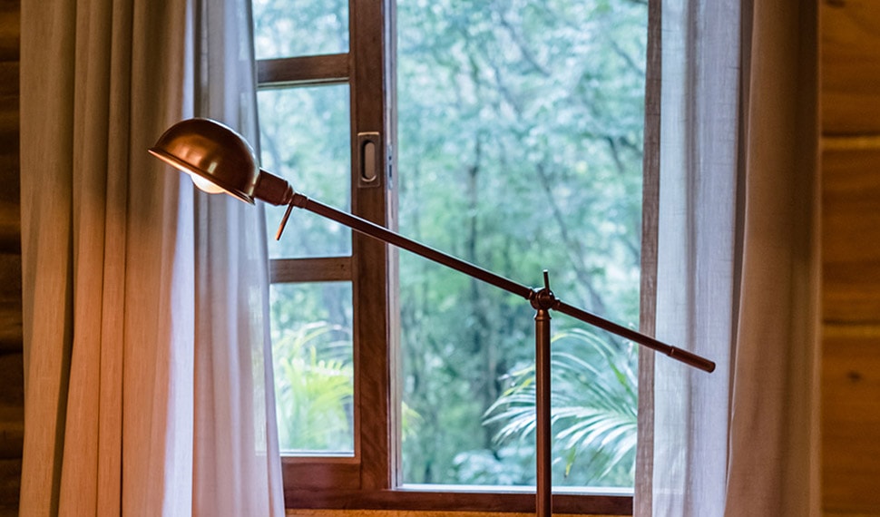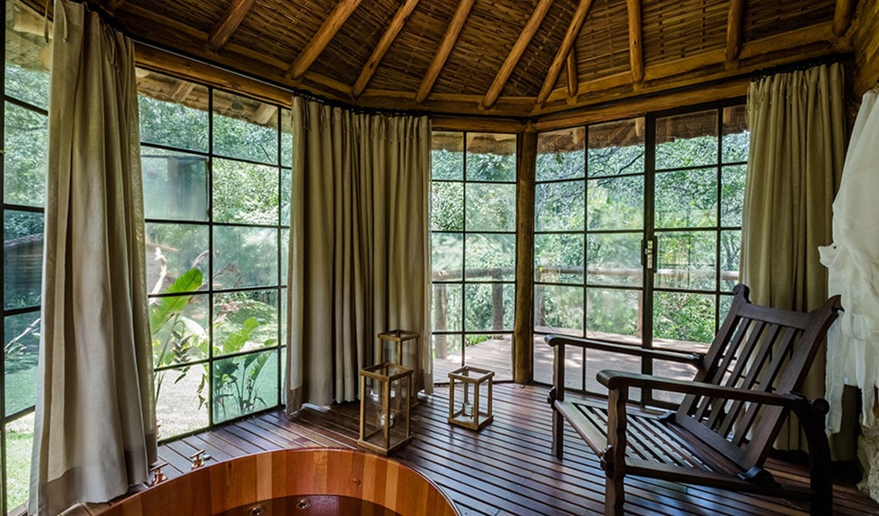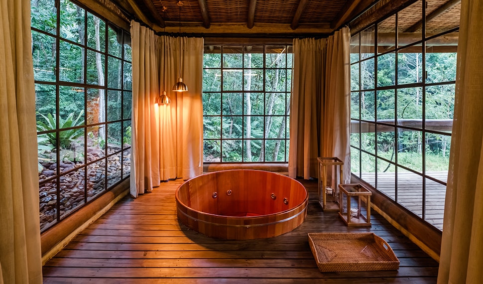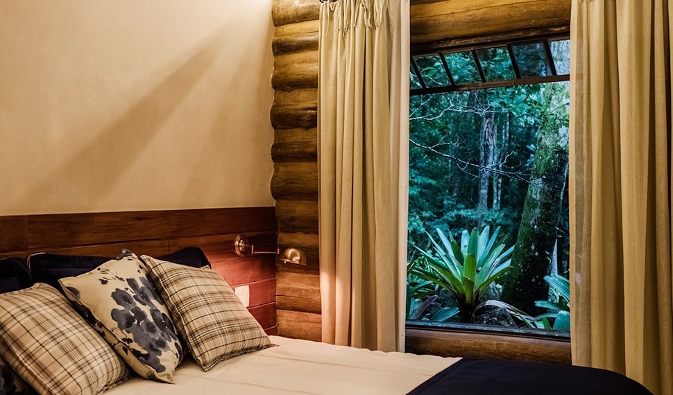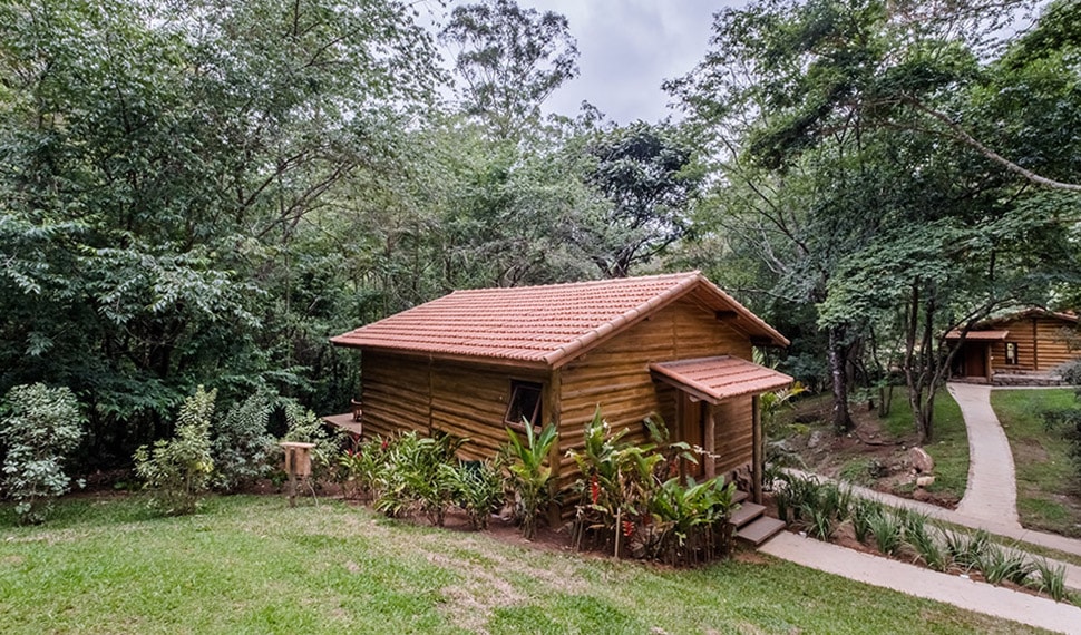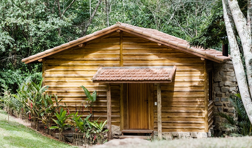 Chalé privativo com 40m², possui um ofurô para o casal e varanda. Equipado com cama king size, lareira, ar quente e frio, frigobar e toalheiro térmico.